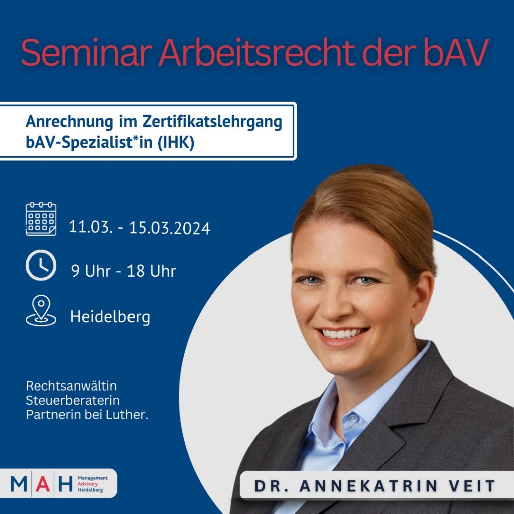 📢 Tolle Neuigkeiten im Bereich Arbeitsrecht! 🌟 Wir freuen uns sehr, Ihnen mitteilen zu können, dass wir Frau Dr. Annekatrin Veit als weitere Referentin für das Fachgebiet „Arbeitsrecht der betrieblichen Altersversorgung“ gewinnen konnten. Vom 11. bis zum 15. März 2024 können Sie bereits Frau Dr. Veit in Heidelberg im entsprechenden Seminar „Arbeitsrecht der bAV“ erleben. Erhalten Sie tiefgehende Einblicke […]