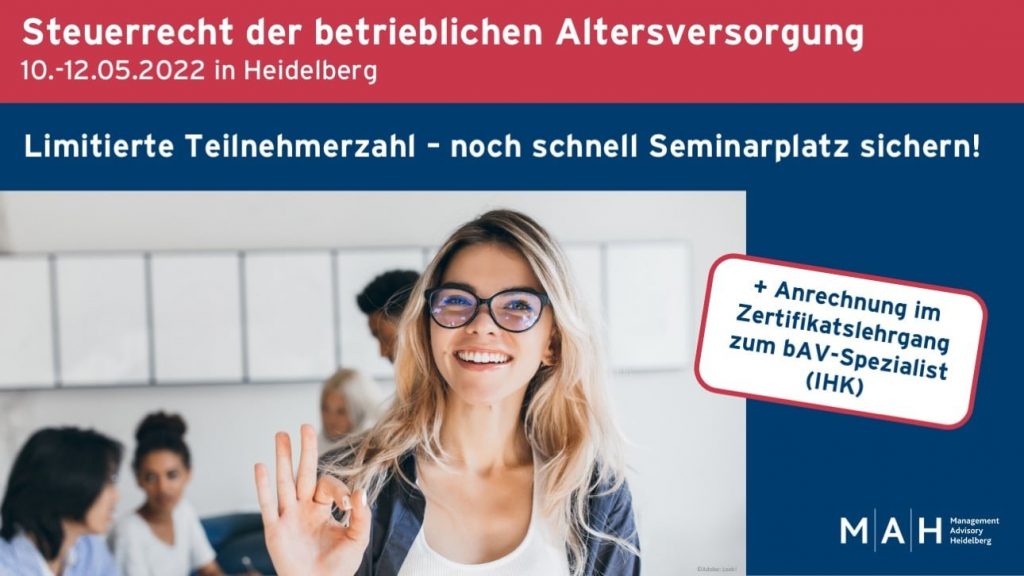 Schon angemeldet? Vom 10.5.2022 bis 12.05.2022 findet das Seminar Steuerrecht der betrieblichen Altersversorgung in Heidelberg statt! Praxisnah vermittelt Sascha Bozenhardt die erforderlichen steuerlichen Kenntnisse der bAV. Sichern Sie sich noch schnell einen Seminarplatz! ⚠️ WICHTIGER HINWEIS: Belegen Sie zusätzlich das Seminar „Arbeitsrecht der betrieblichen Altersversorgung“ und werden Sie „bAV-Spezialist (IHK)“: https://bit.ly/3LqfsRI #Seminar #Steuerrecht #bAV #betrieblicheAltersversorgung […]
